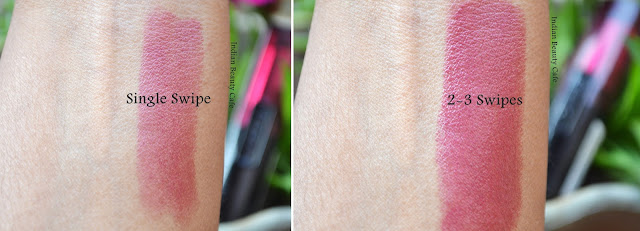 Below are the swatches. It is opaque in 1 swipe. You can also add layers to intensify the color, so buildable coverage! Feels very light on lips too!